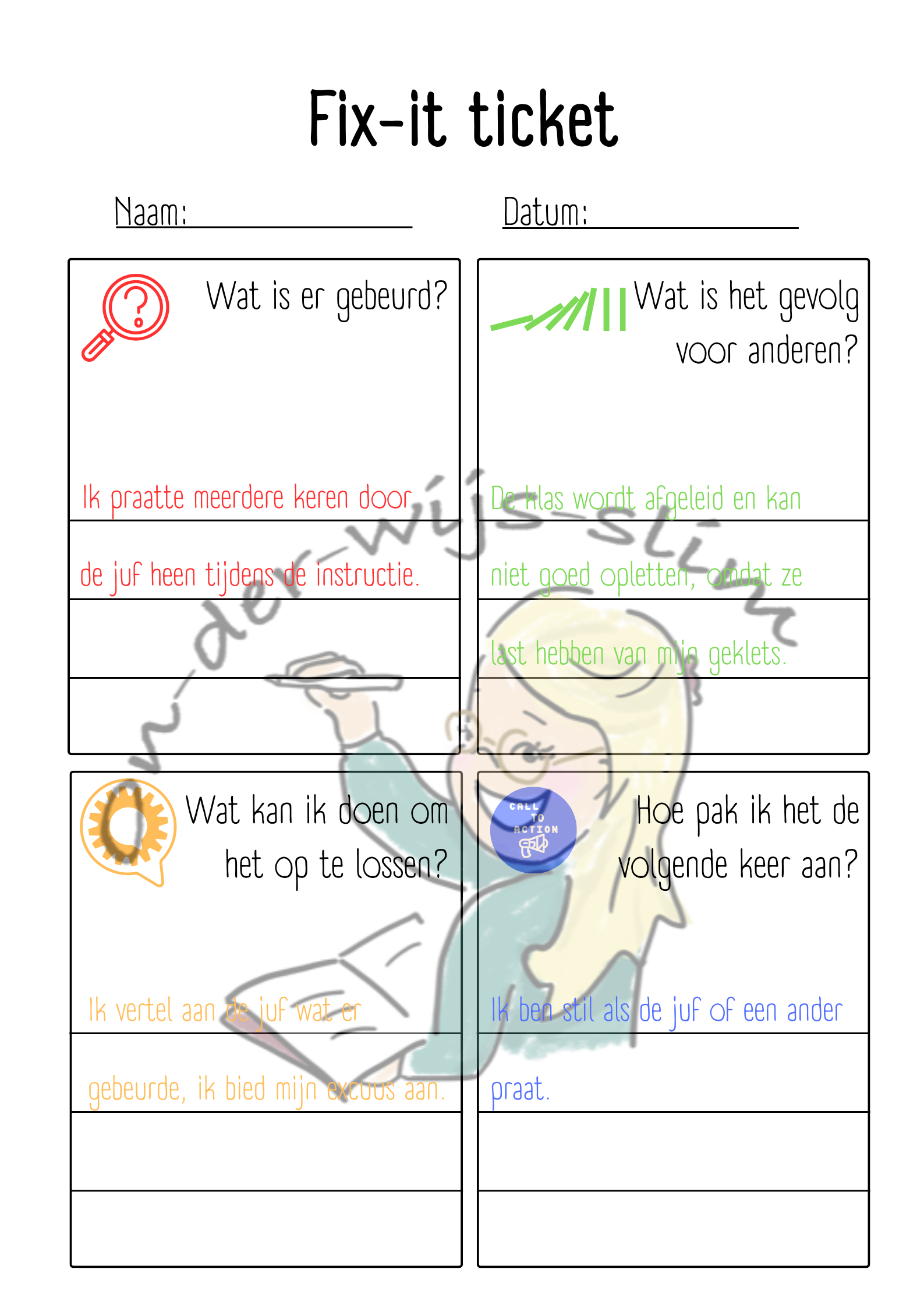 Het Fix-it ticket is een praktisch reflectieformulier dat leerlingen helpt om verantwoordelijkheid te nemen voor hun gedrag en actief te werken aan herstel. Dit instrument ondersteunt gedragsontwikkeling door leerlingen stap voor stap te laten nadenken over wat er is gebeurd, wat de impact was op anderen en hoe zij het de volgende keer anders kunnen aanpakken.
